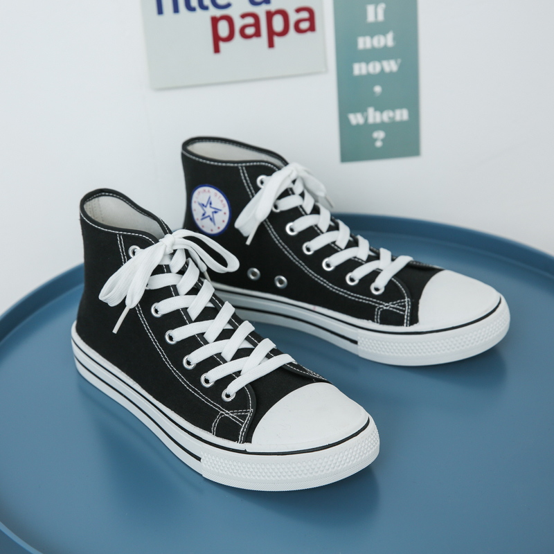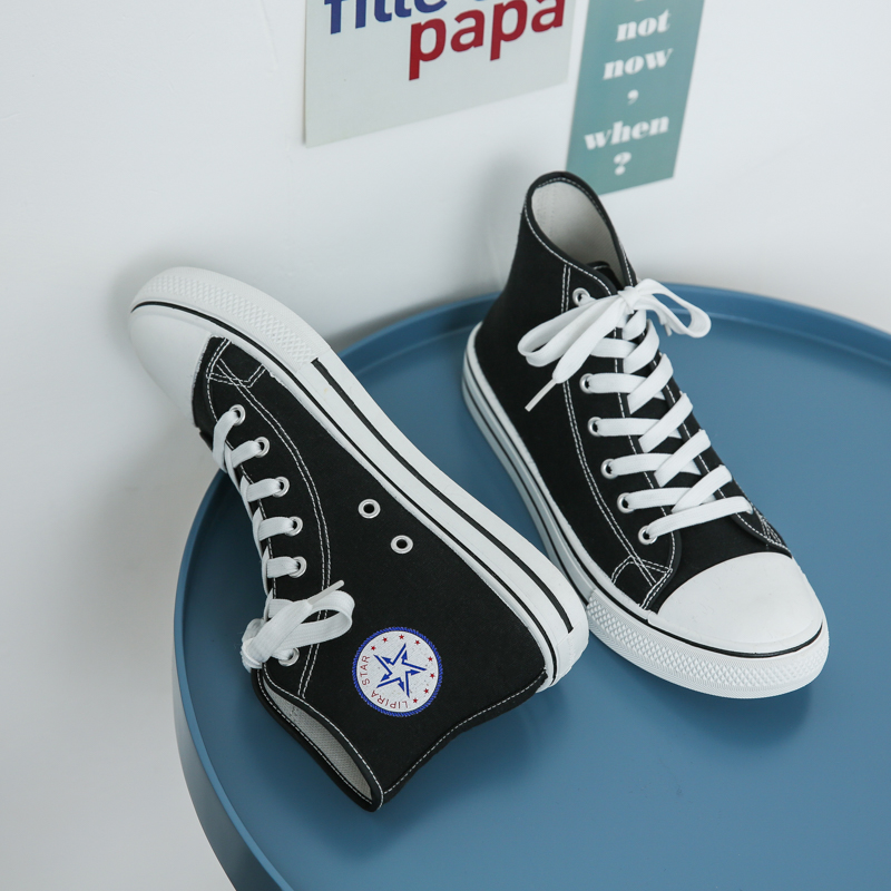 This classic black high-top canvas shoe features a simple and elegant design, making it a versatile choice for everyday wear. The upper is made of high-quality canvas material, offering breathability and durability for all-day comfort. The non-slip rubber sole enhances grip, ensuring walking safety. The timeless black-and-white color combination is stylish yet understated, suitable for various occasions, including campus life, casual outings, or daily commuting. The reinforced toe design improves durability, while the white laces add a touch of brightness to the overall look. This unisex shoe is an ideal choice for those seeking both comfort and style.