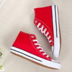 “These classic red high-top canvas sneakers are the ultimate blend of timeless style and everyday comfort. Featuring a durable canvas upper, breathable design, and a sturdy rubber sole, they are perfect for casual outings or completing your streetwear look. With their unisex appeal and versatile design, these sneakers are a wardrobe essential, offering both style and functionality for any season.”
