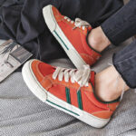 Order these orange and green canvas sneakers now and step out in retro style with unmatched comfort!