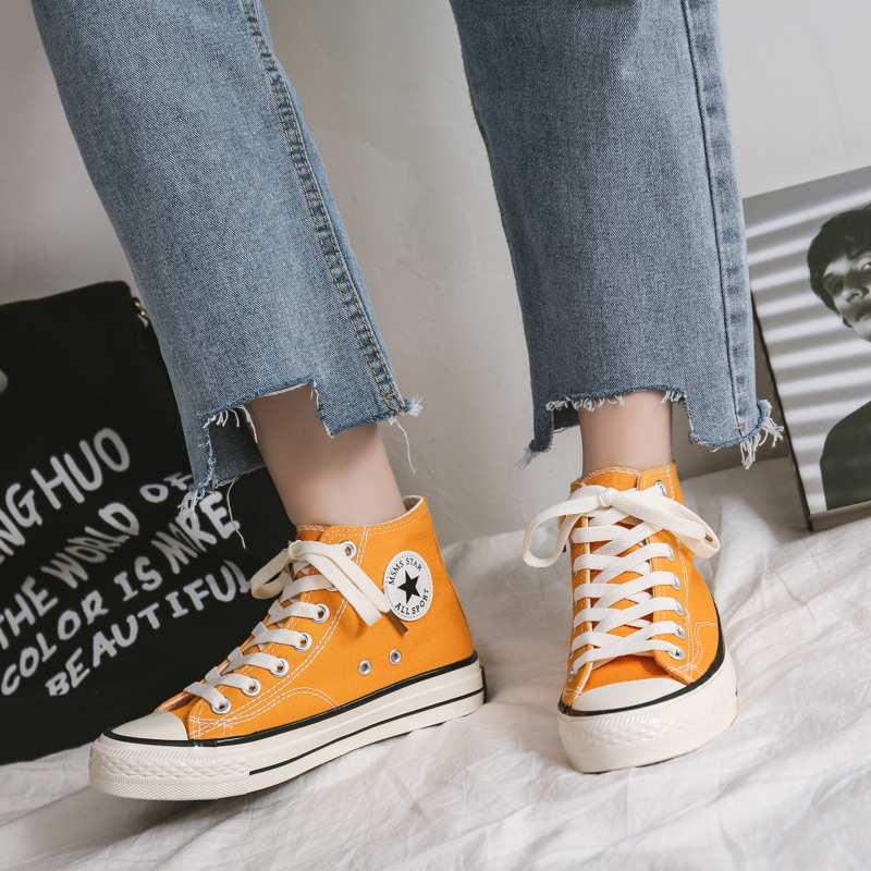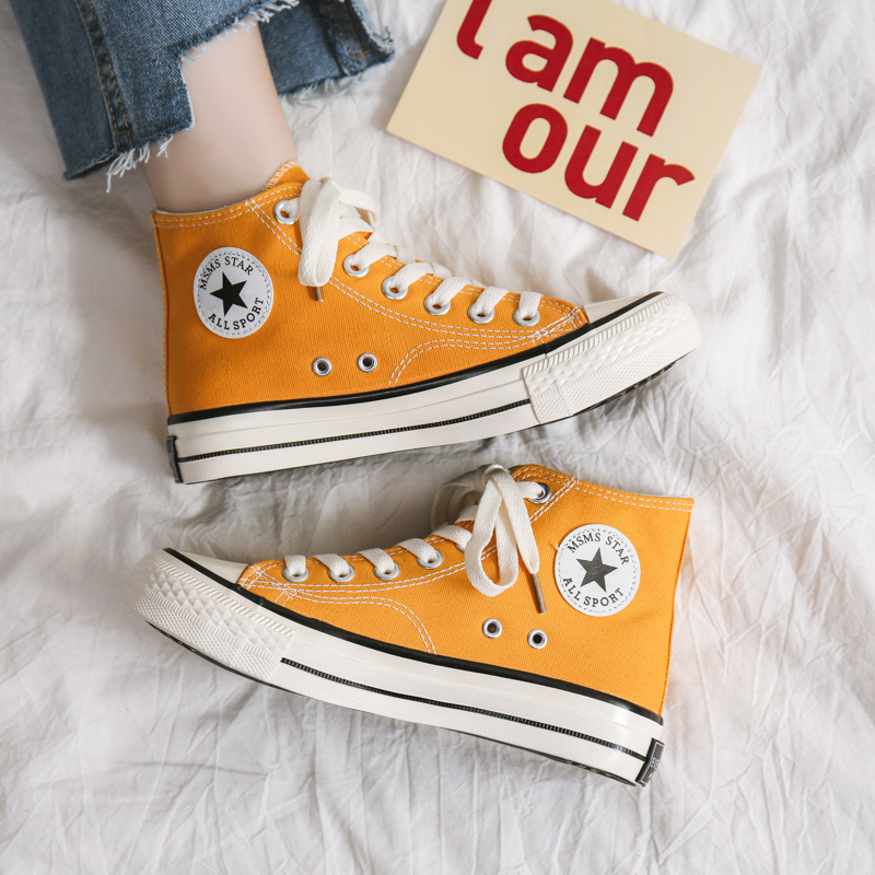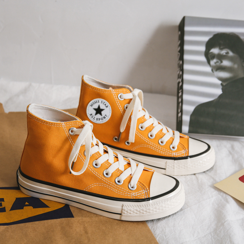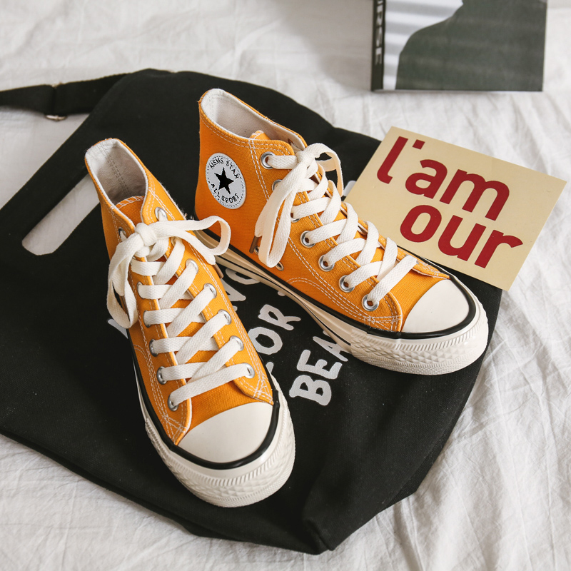 Combining retro aesthetics with modern comfort, these yellow high-top canvas shoes are durable, stylish, and versatile. Elevate your daily style with this essential pair of sneakers.