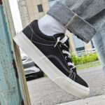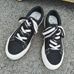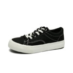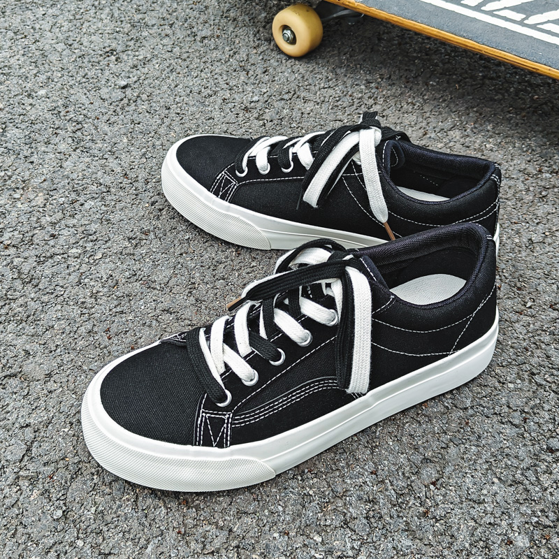 These black low-top canvas shoes feature a timeless minimalist design with a black upper accented by white stitching and laces, making them effortlessly stylish and versatile. Made with high-quality canvas material, they are soft, breathable, and paired with a durable anti-slip rubber sole for lasting comfort and reliability. Perfect for daily wear, campus life, or casual outings.