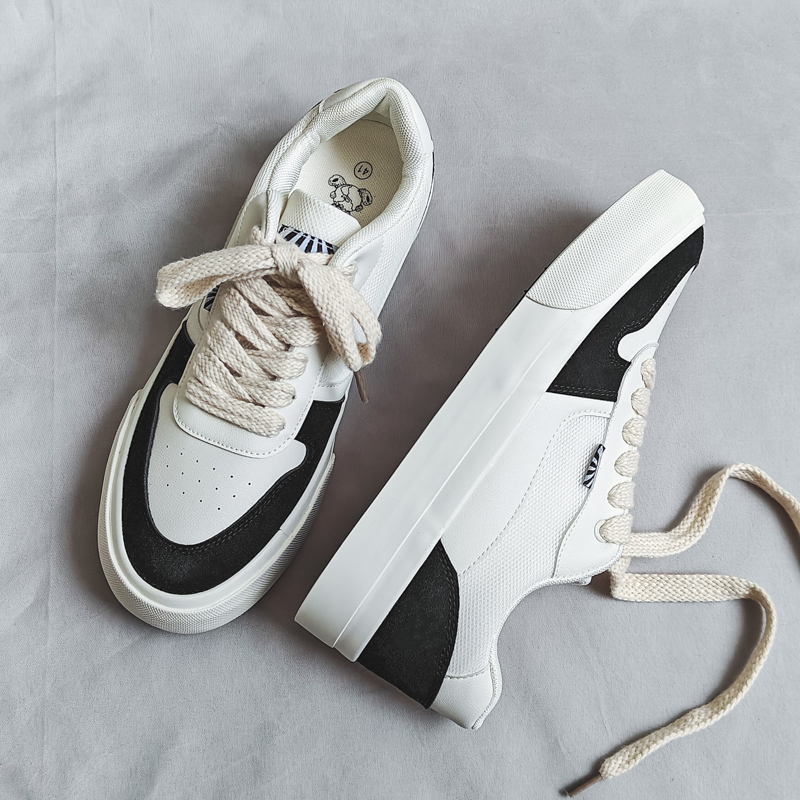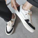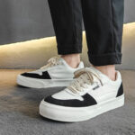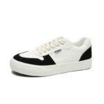 These stylish casual sneakers feature a classic black and white color-block design, delivering a sleek and modern urban look. Crafted with premium synthetic leather and canvas materials, the upper offers a soft touch and breathable comfort. The sturdy rubber sole provides excellent anti-slip and wear-resistant performance. Lightweight construction and a soft insole ensure all-day comfort, making these sneakers perfect for streetwear, commuting, or casual outings.
